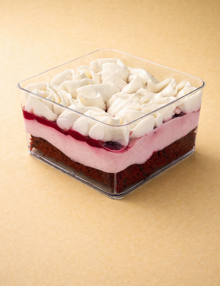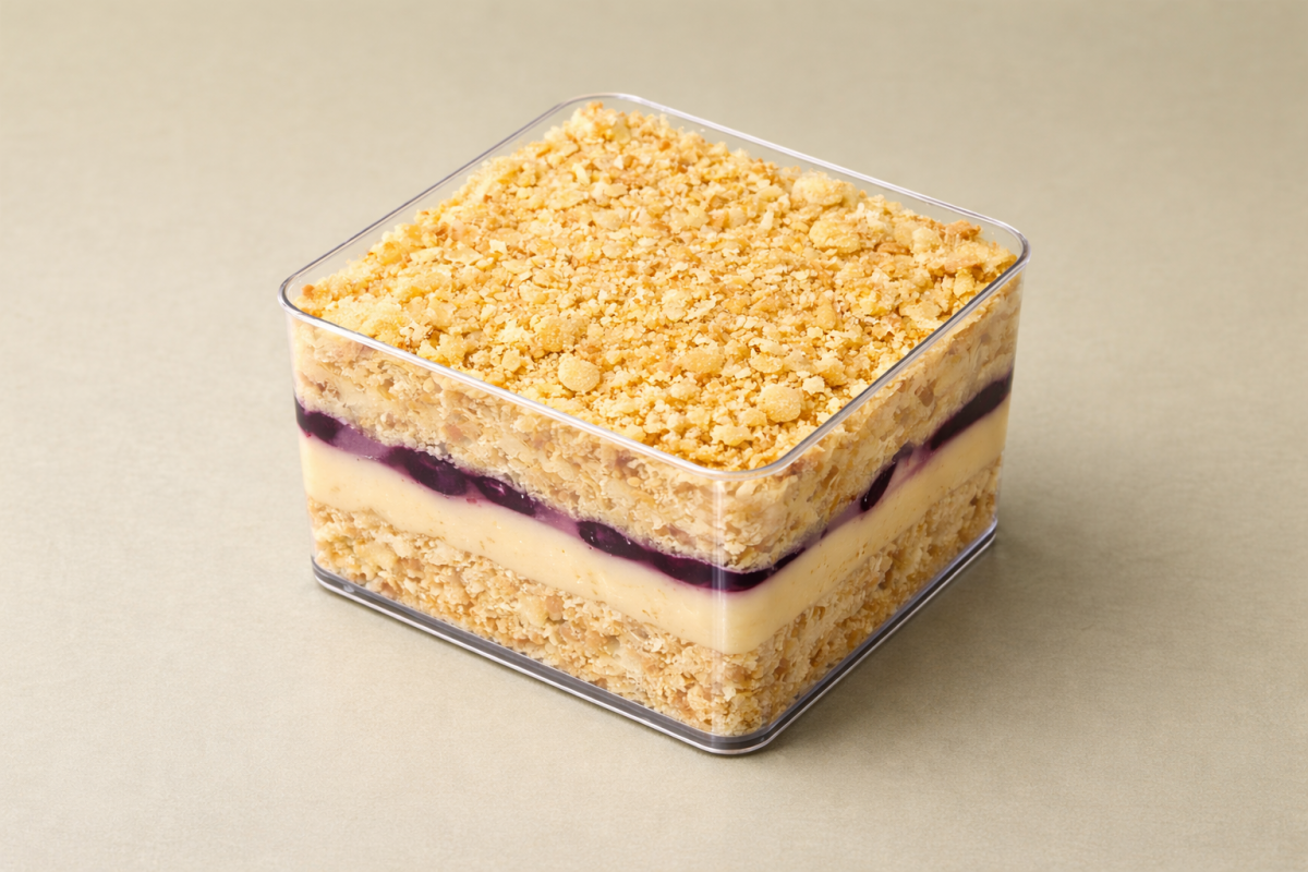 Тонкие слоёные коржи, рассыпчатая крошка и деликатный карамельный крем образуют бархатистую основу. Кули из личи и ежевики раскрывает десерт яркой, изящной ягодной нотой. добавляет свежесть и деликатную кисло‑сладкую ноту. Баланс текстур и вкусов в каждом кусочке.